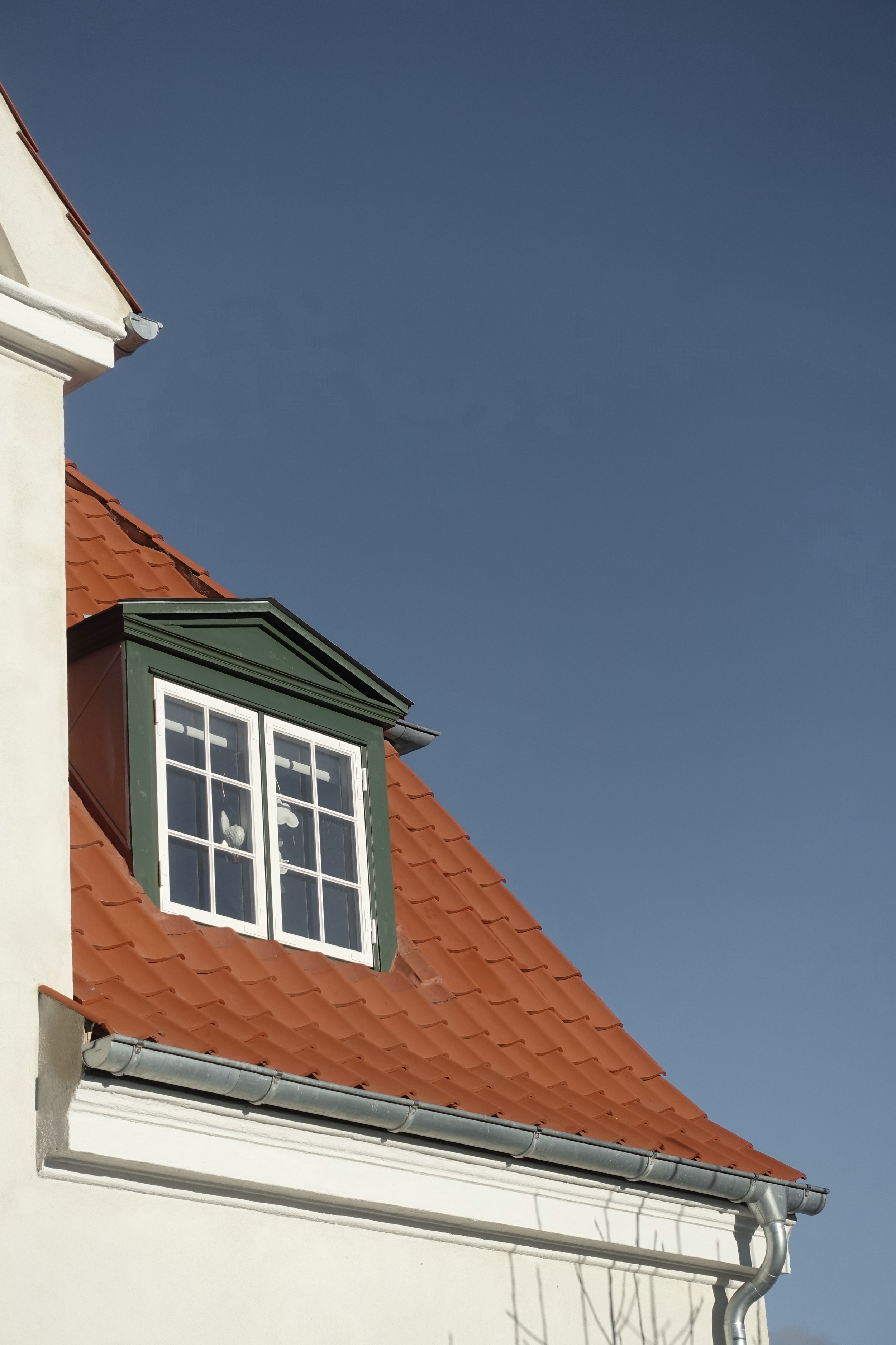 The facades were rendered in a warm white, while the windows were replaced and a few additional ones introduced. The roof was renewed with tiles in a soft red hue, and all woodwork was treated with linseed oil, preserving the home’s authentic charm.